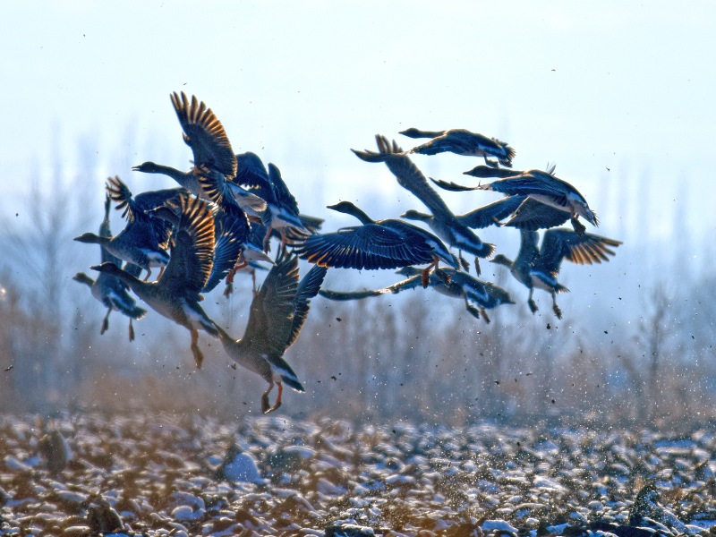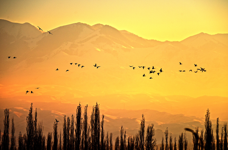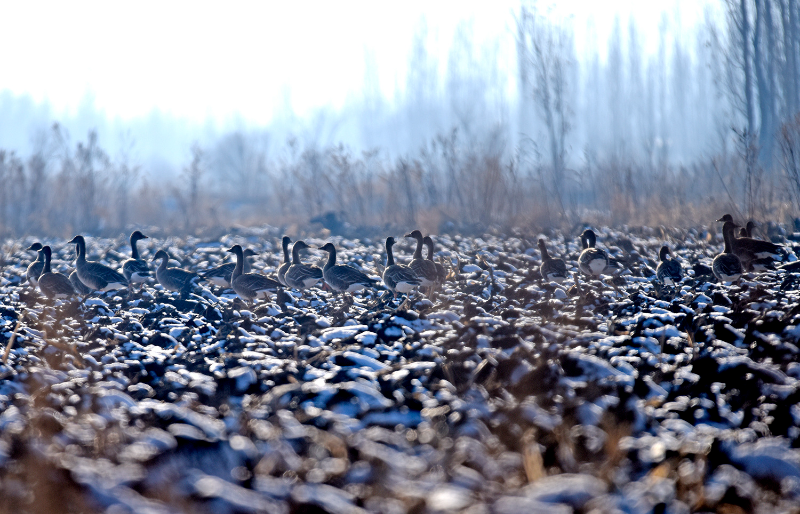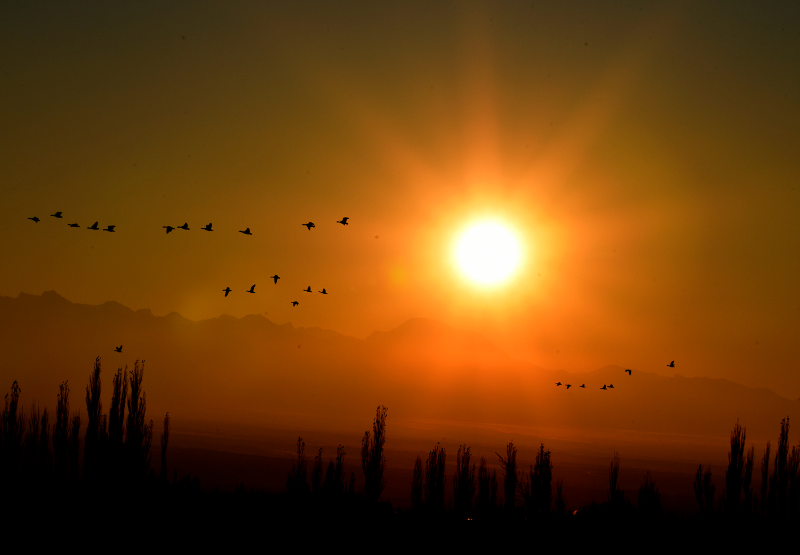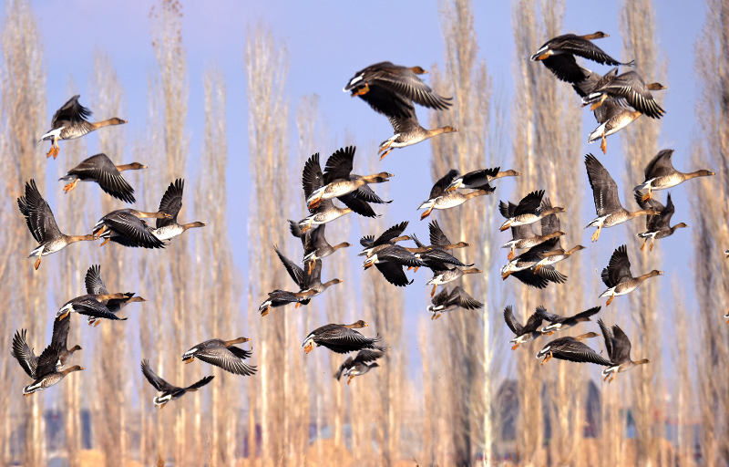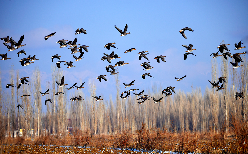 12月1日,新疆伊犁哈萨克自治州伊宁县英塔木镇的田地里飞来了几百只大雁,密密麻麻一片,蔚为壮观。鸟儿时而悠闲地散步,时而嬉戏蹦跳,时而在天空中翩翩起舞,它们飞翔着不断变换着队形,一会儿呈一字形,一会儿呈人字形,从远处看,像极了漫天飞舞的风筝。