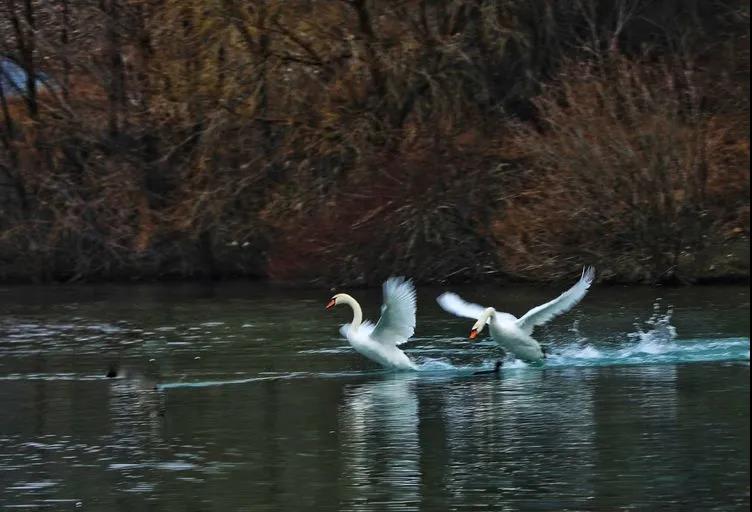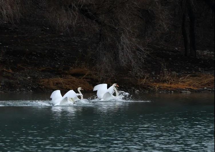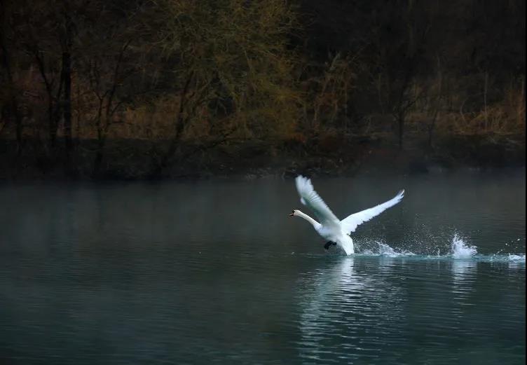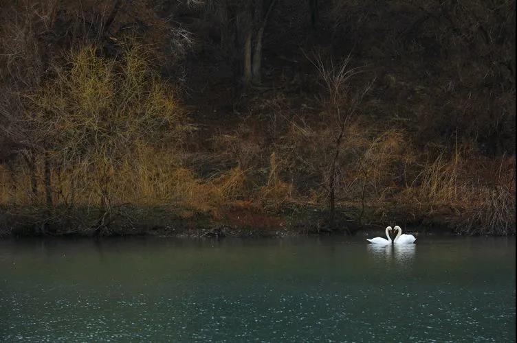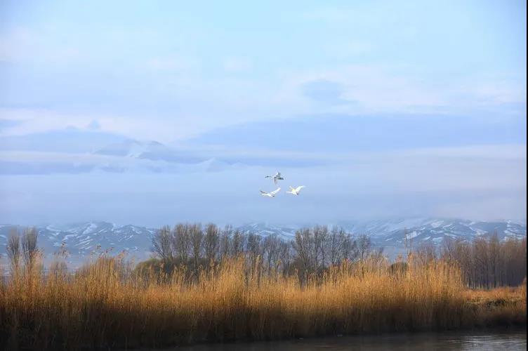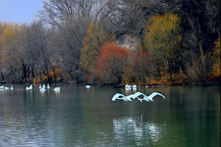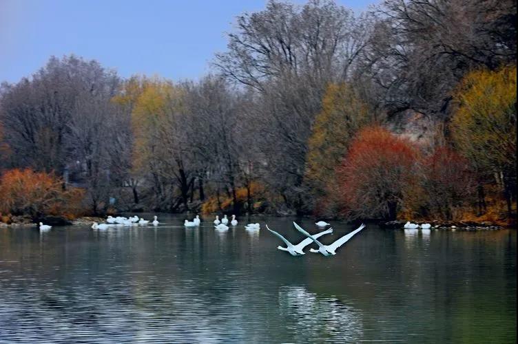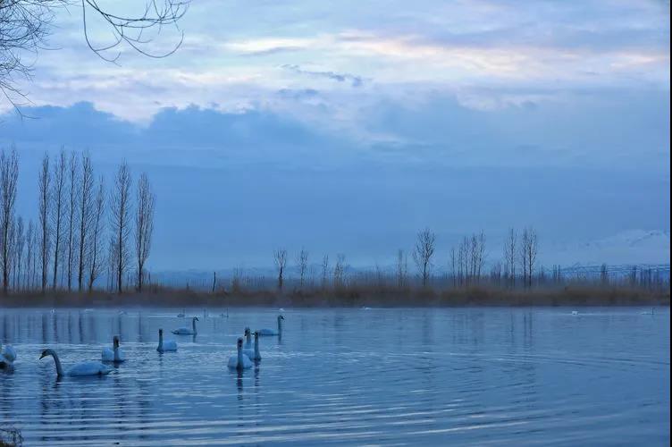 早晨天蒙蒙亮,我们又来到英塔木镇天鹅泉,只为在天鹅飞走之前再拍几张天鹅的照片。到达天鹅泉时还在下小雨,不一会儿,雨停了,天渐渐变蓝,还伴有粉色的霞光,运气不错。天鹅开始活跃起来,一拨又一拨,先是从西向东飞,后又从东向西飞,最早到达的都是些执着的摄影爱好者,然后陆陆续续来的是观赏天鹅的游客。