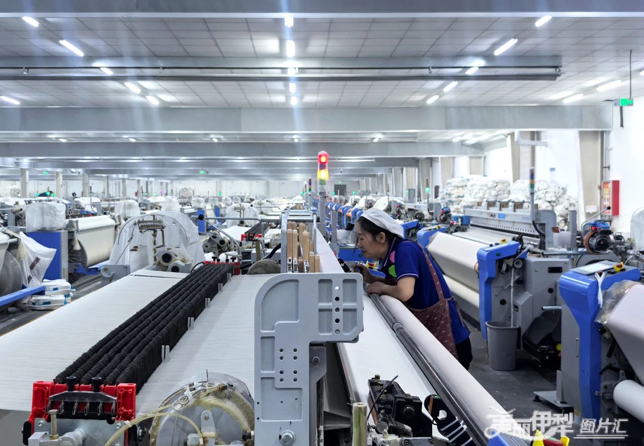 在新疆某纺织科技有限公司生产车间,由母公司自主研发生产的高速智能喷气织机正高速运转,银色天丝飞舞成锭,棉锭在织布机的哒哒声中,变成了宽窄不等的坯布,经过验布员仔细检查后,这批坯布将打包运往江苏等地。