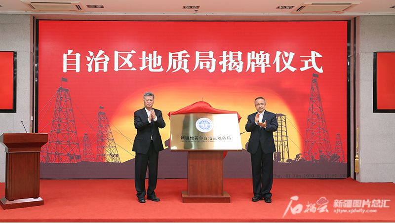 9月15日,自治区党委书记马兴瑞,自治区党委副书记、自治区主席艾尔肯·吐尼亚孜为新疆维吾尔自治区地质局揭牌。天山网-新疆日报记者谢龙摄
