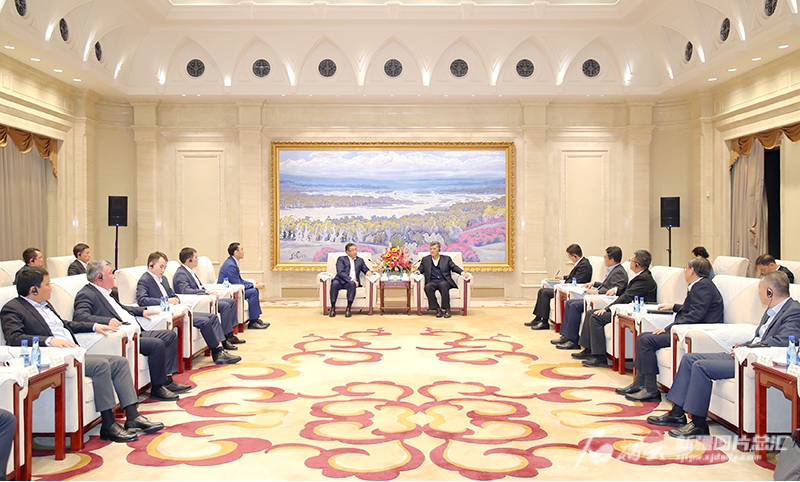 11月28日,自治区党委书记马兴瑞在乌鲁木齐会见哈萨克斯坦阿拜州州长乌兰哈耶夫一行。石榴云/新疆日报记者崔志坚摄