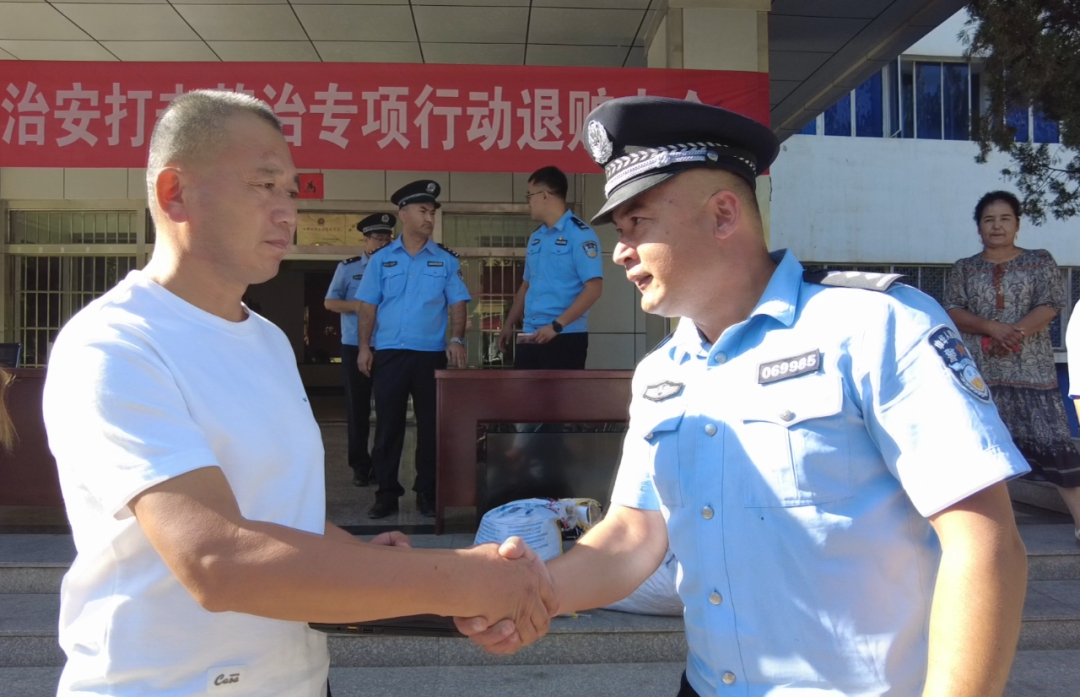 8月25日上午,伊宁县公安局举行夏季治安打击整治专项行动退赃大会,现场为群众依法退还追缴的车辆、现金及其他赃款赃物,共计价值12.25万元。