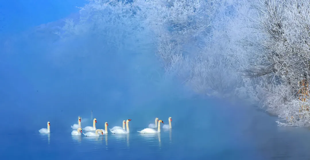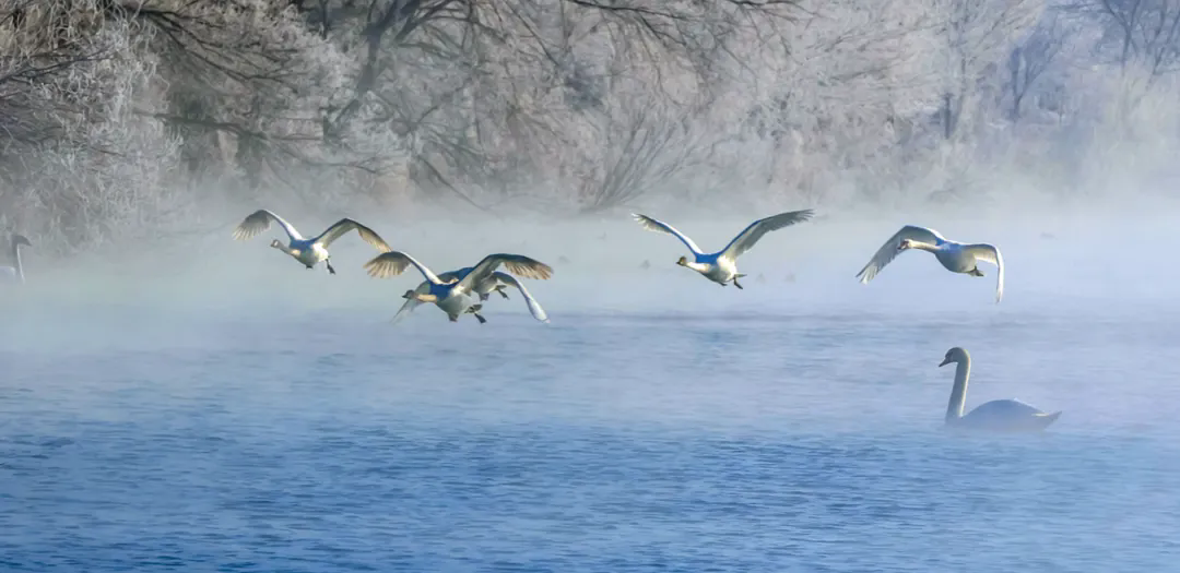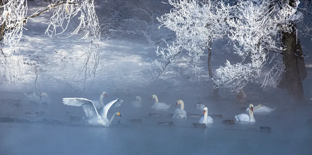 天鹅是这冰雪世界里最灵动的“诗”。它们披着雪似的羽衣,浮在氤氲着热气的泉面上,红喙轻点水波,漾开一圈圈细碎的涟漪,把雾凇的倒影揉成柔美的曲线。有的将脖颈蜷成优雅的“S”形,静静浮着,仿佛与这雾凇、这寒泉融为了一体;有的忽然振翅,雪白的羽翼拍开薄雾,翅膀带起的风拂过枝头,冰晶簌簌落下,像一场细碎的雪。飞起来的天鹅群,在雾凇林的背景里划出银白的弧线,鸣声清越,穿透了晨雾,在寂静的冬日里荡开。