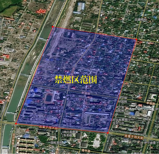 (一)县城建城区禁燃区域:滨河北路以东、环城路以南、五道桥路以西、吉里于孜大街以北合围区域。