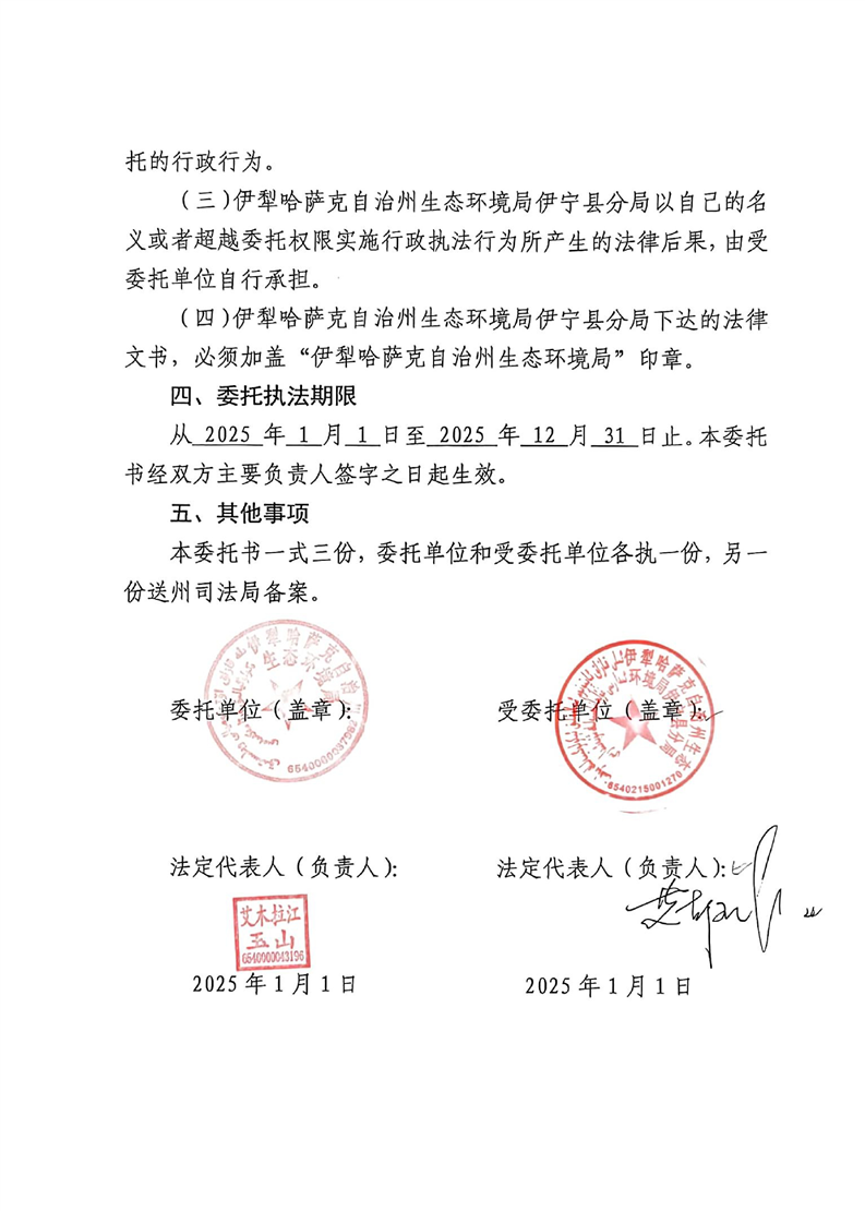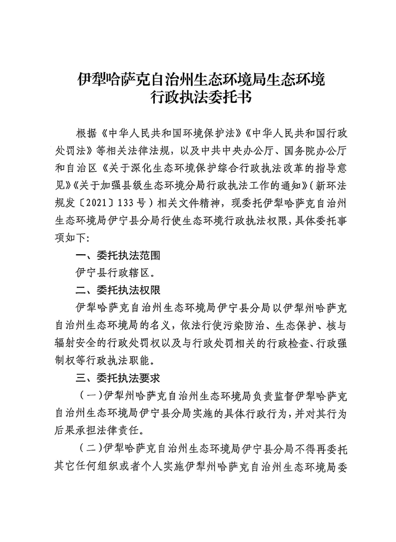 伊犁哈萨克自治州生态环境局生态环境行政执法委托书