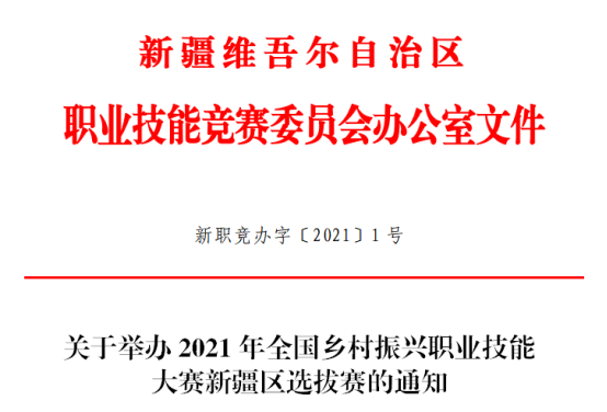为深入贯彻落实党中央、国务院关于乡村振兴工作的重大决策部署和习近平总书记关于技能人才工作的重要指示精神,充分发挥职业技能大赛在促进就业、推动技能人才培养和弘扬工匠精神中的重要作用,选拔优秀选手代表自治区参加全国乡村振兴职业技能大赛,自治区竞赛委员会办公室决定举办2021年全国乡村振兴职业技能大赛新疆区选拔赛(以下简称“自治区选拔赛”)。现将有关事项通知如下: