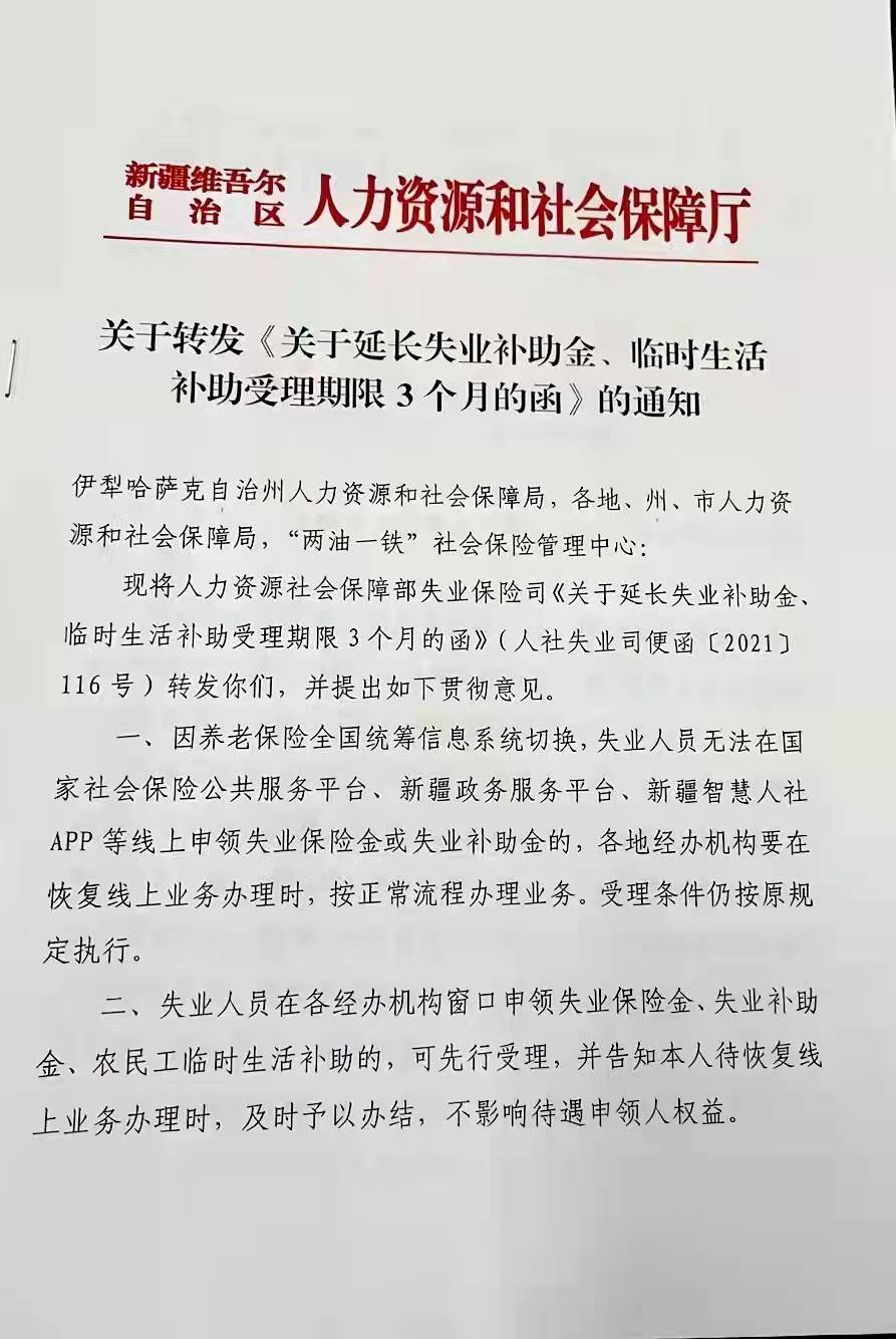 根据国家和自治区统一安排通知,因受养老保险全国统筹信息系统切换影响,失业人员无法在各类平台申领失业保险金和失业补助金,为确保符合条件的失业人员应享尽享,特将受理时限延长至2022年3月底。