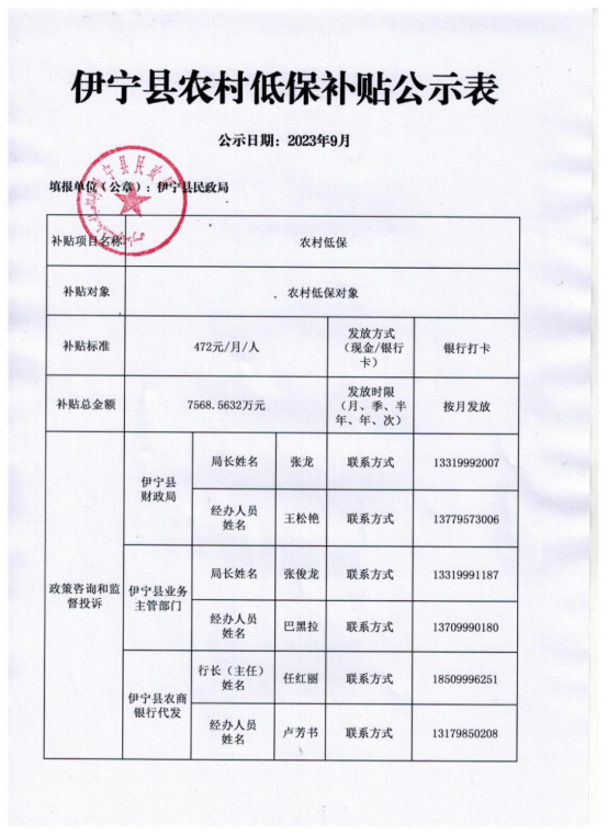 伊宁县农村低保补贴公示表