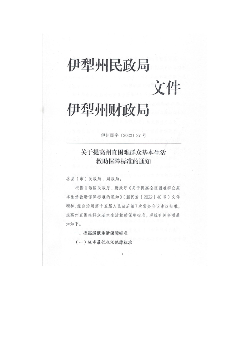 关于提高州直群众基本生活救助保障标准的通知 伊州民字【2022】27号