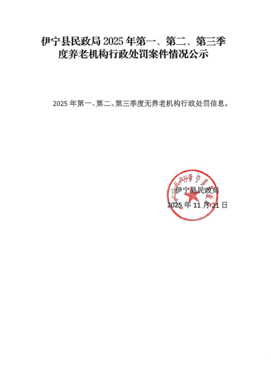 伊宁县民政局2025年第一、第二、第三季度养老机构行政处罚案件情况公示