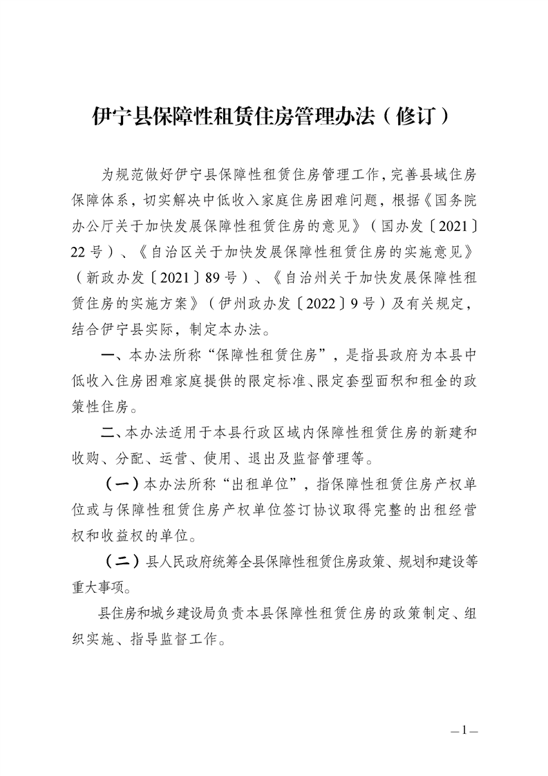 《伊宁县保障性租赁住房管理办法(修订)》已经县人民政府研究通过,现印发给你们,请认真抓好贯彻落实。