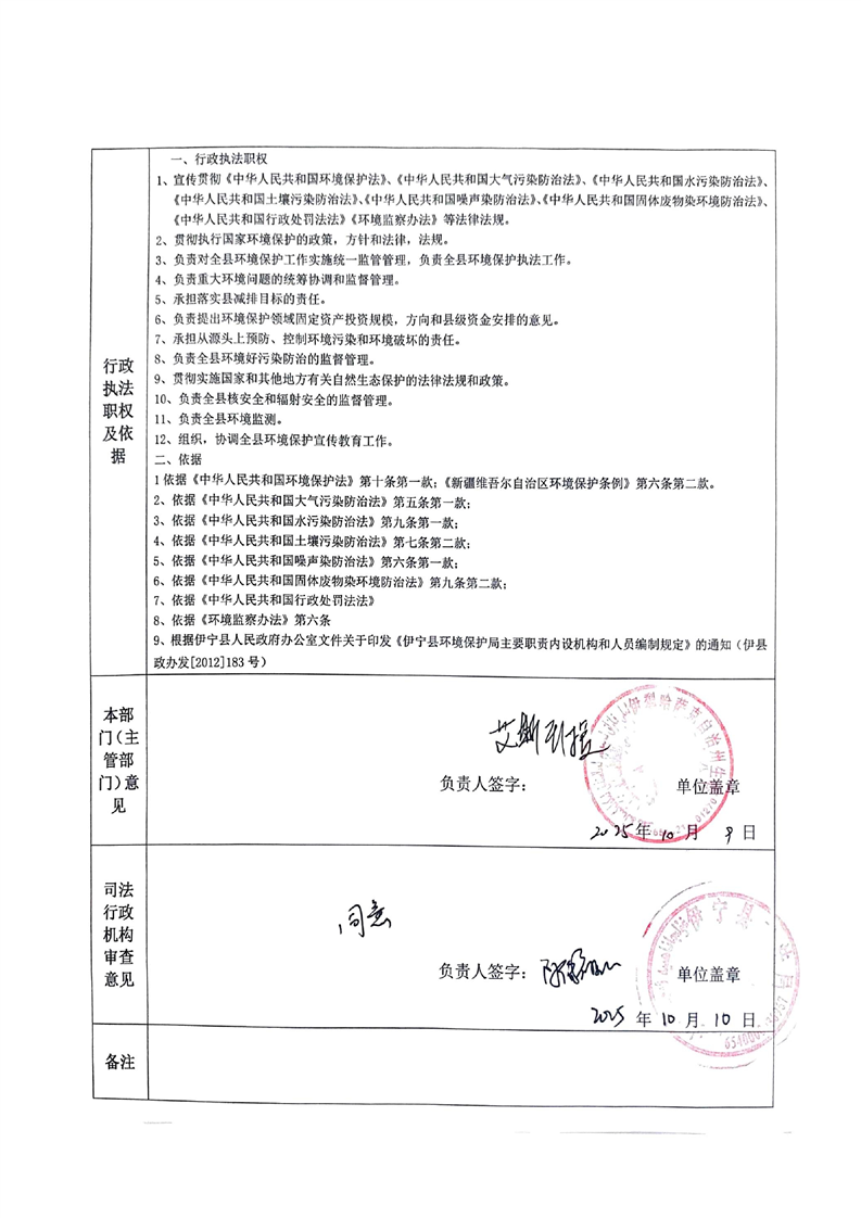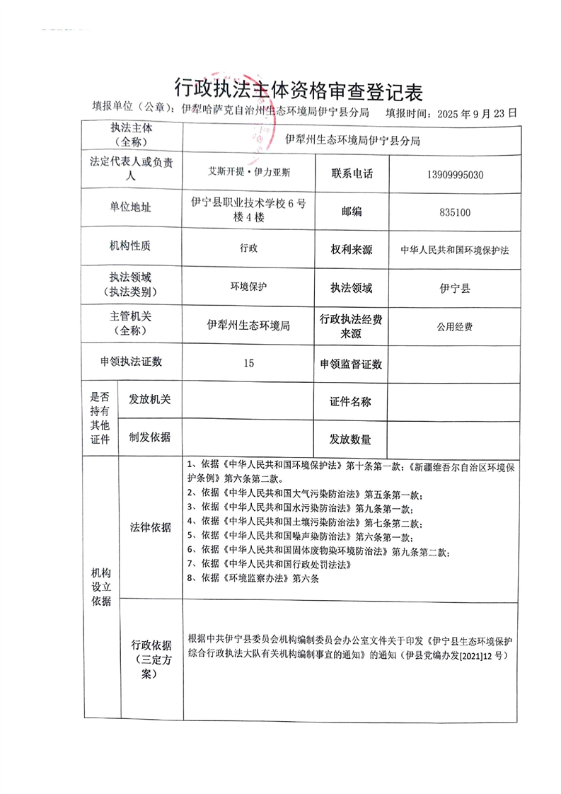 伊犁哈萨克自治州生态环境局伊宁县分局行政主体资格审查表