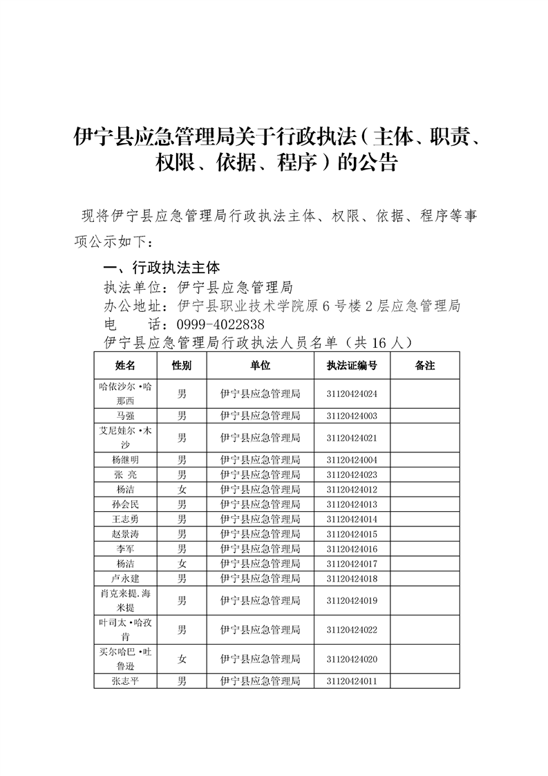 伊宁县应急管理局关于行政执法(主体、职责、权限、依据、程序)的公告