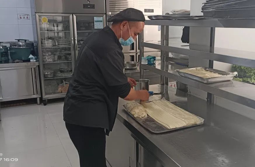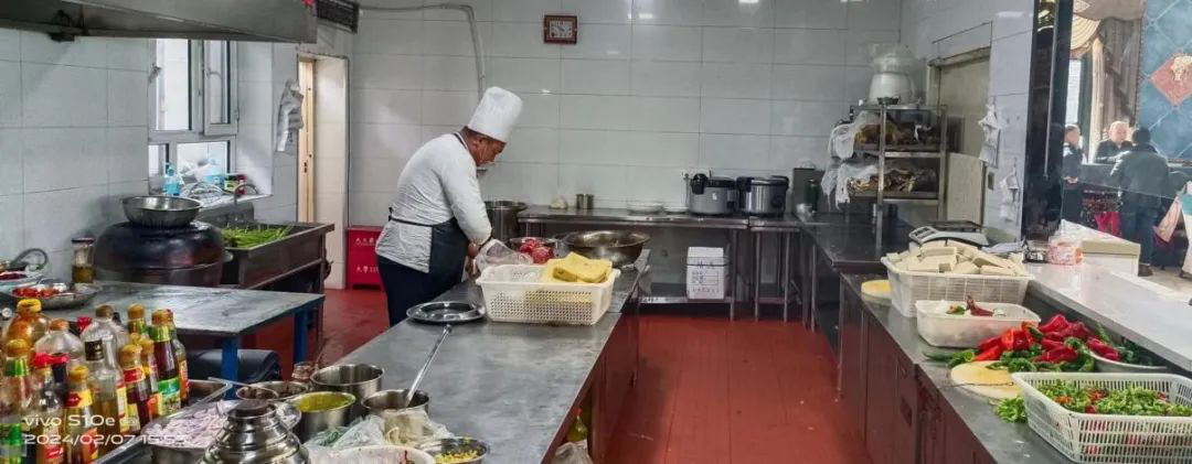 从业资质齐全并公示;后厨干净,油烟机无积垢、排水沟无积水,地面无油渍,餐饮用具符合消毒保洁要求,操作台面整体卫生良好;冷藏设施内摆放整齐,明显位置张贴反食品浪费标识。