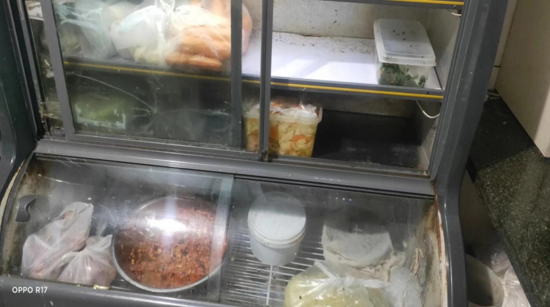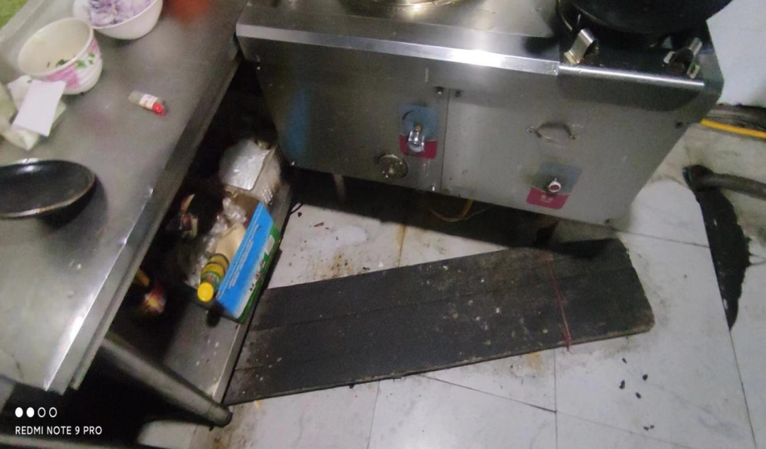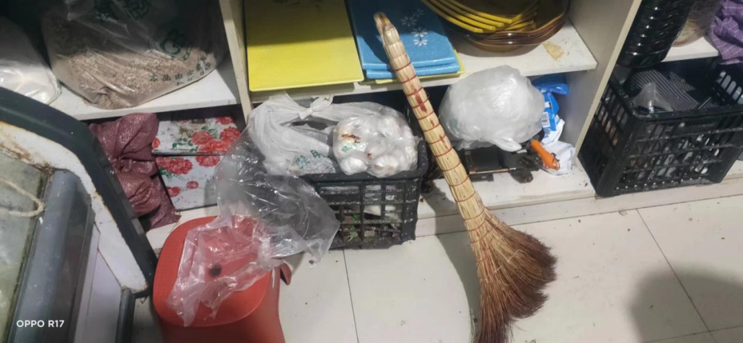 经营场所卫生脏乱差;设施设备未及时清理;柜内摆放杂物,冰箱内生熟未分开存放,对半成品未包保鲜膜,食品落地摆放,消毒柜内的餐具未按要求规范摆放,未按要求落实进货查验记录。