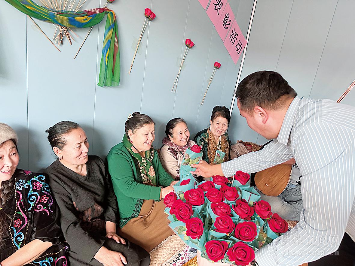为庆祝“三八”国际劳动妇女节,丰富社区妇女精神文化生活,3月4日,伊宁县阿乌利亚乡阿热博孜西社区“两委”和伊宁县卫健委驻阿乌利亚乡阿热博孜西社区工作队联合举办了一场别开生面的优秀妇女表彰大会和民族团结联谊活动。图为阿热博孜西社区为妇女送上节日礼物。