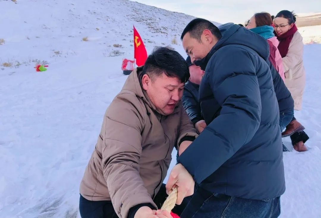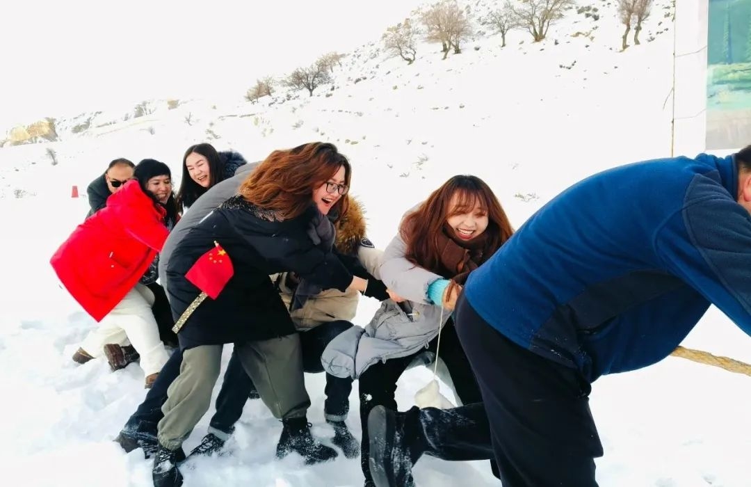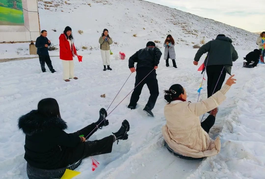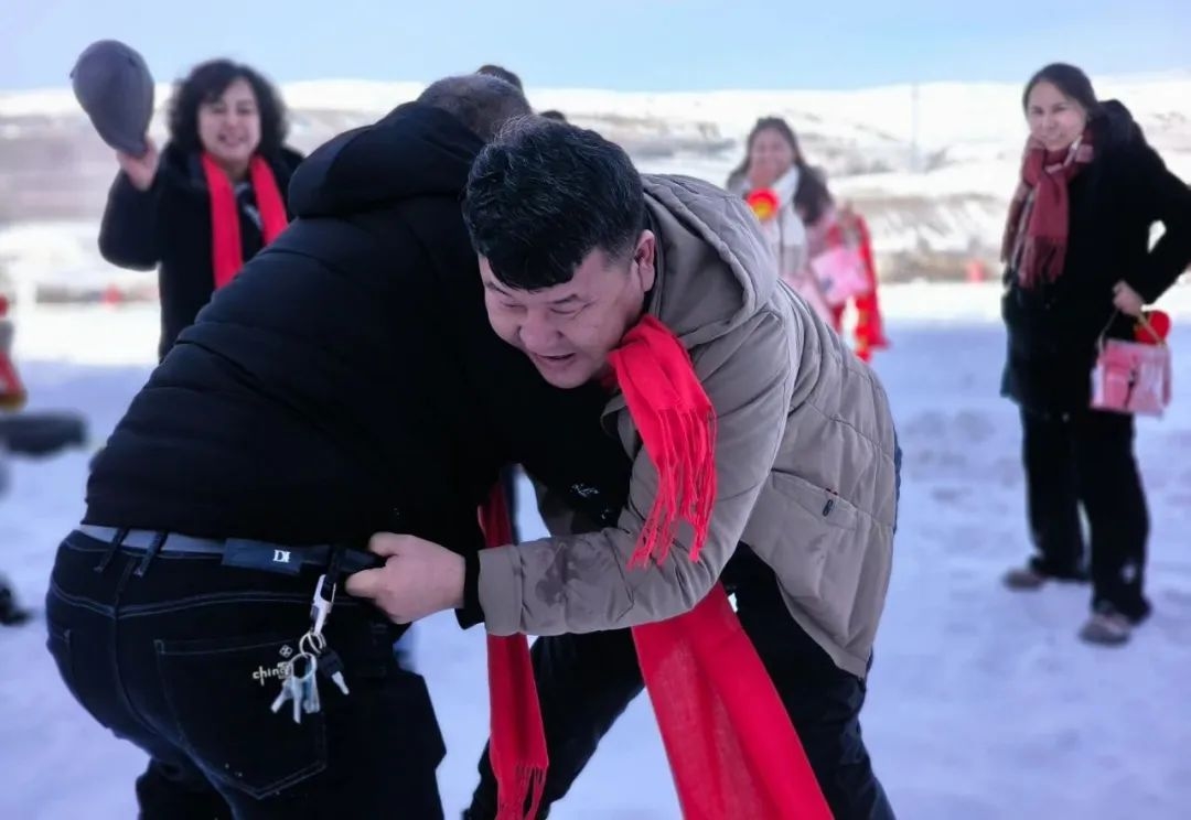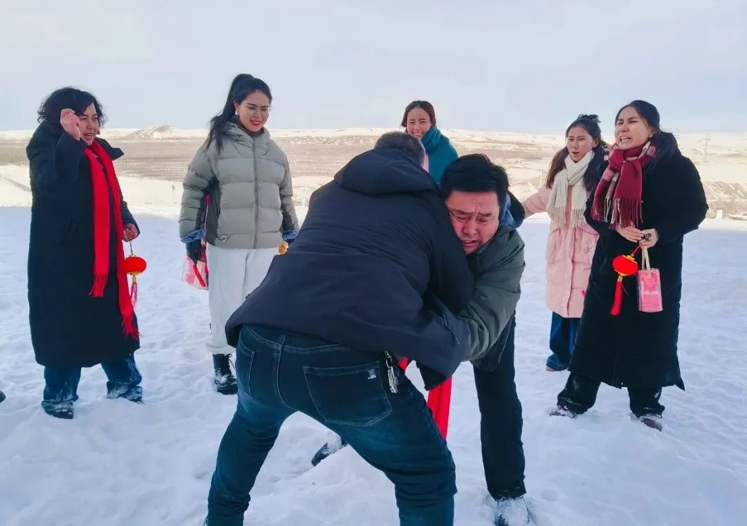 徒步活动结束后,雪地运动会拉开帷幕。运动会项目丰富多样,包括拔河比赛、男女子组拉轮胎、摔跤等。干部们在雪地上展开激烈角逐,现场气氛热烈。拔河比赛中,大家齐心协力,喊着口号往后拔,展现团结协作精神;男女子组拉轮胎比赛,选手们全力以赴,在雪地中奋力前行;摔跤比赛则充分展示选手们的力量与技巧。各项活动吸引了众多干部参与,现场加油声、欢呼声此起彼伏。