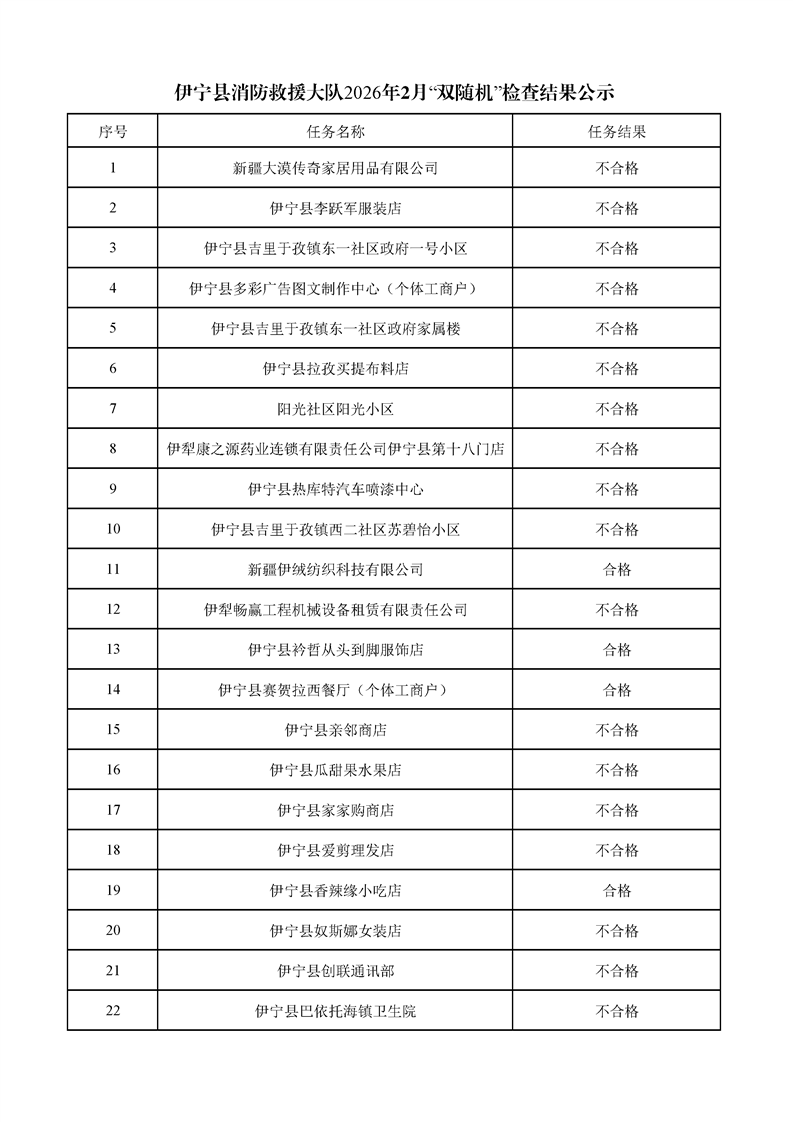 伊宁县消防救援大队2026年2月“双随机”检查结果公示