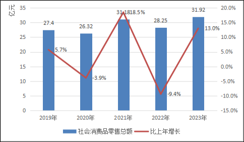 2023年以来,持续加大市场保供扶持力度,全力恢复生产生活秩序,加快恢复消费品市场活力。2023年末共有限额以上商贸企业42家,其中,8家限额以上商贸零售企业、32家限额以上商贸批发企业、2家住宿餐饮企业;6家限上大个体。实现社会消费品零售总额31.92亿元,同比增长13%。