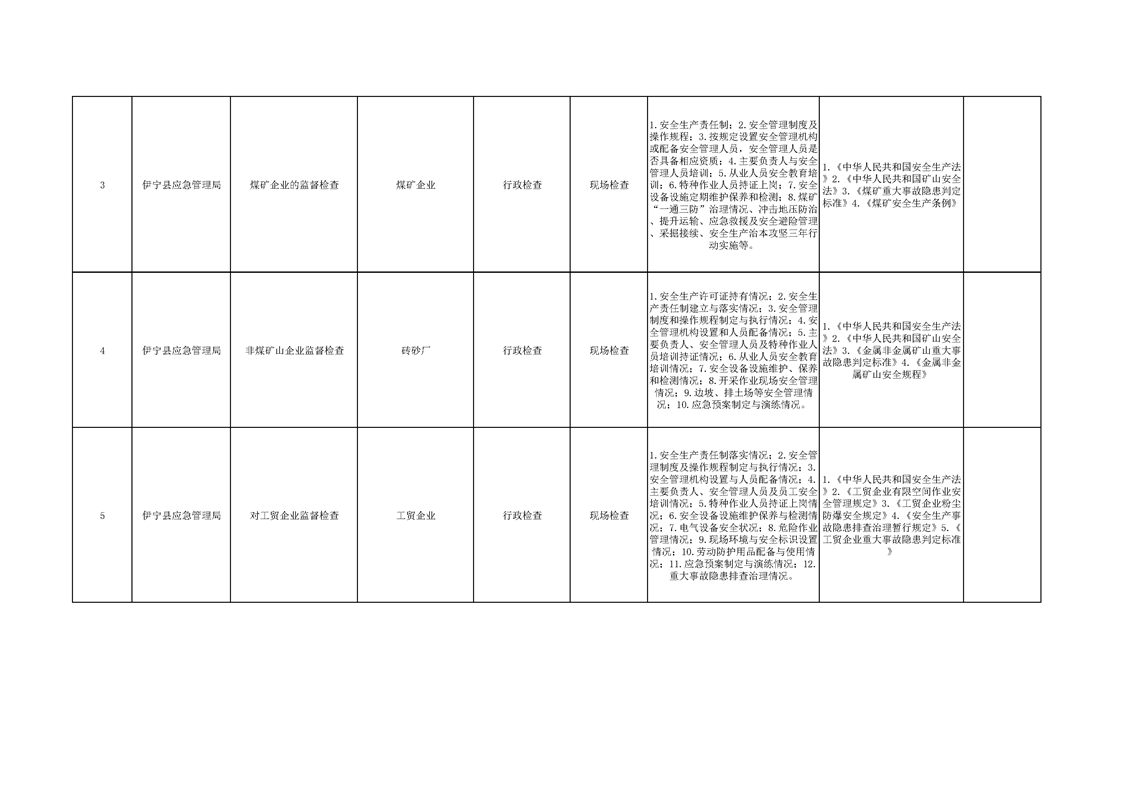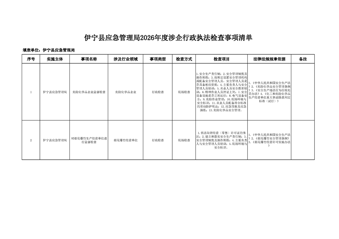 伊宁县应急管理局2026年涉企行政执法检查事项清单