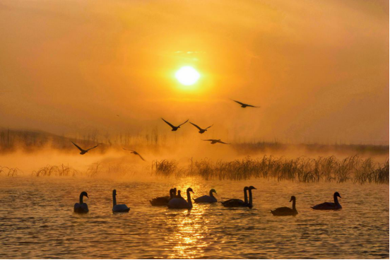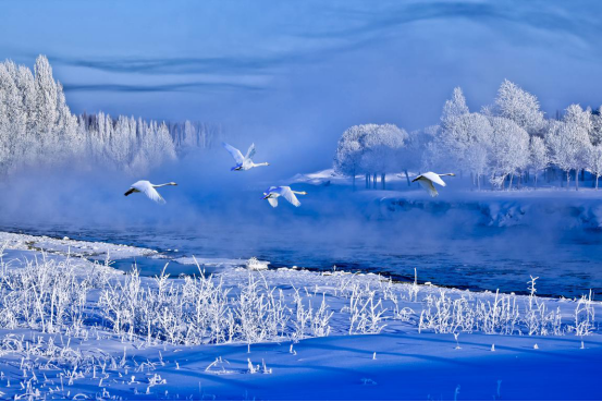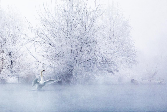 冬天的天鹅泉边聚集着一大片举着“长枪短炮”的摄影师,他们静静的守候、捕捉着眼前的美景:被雾凇包围的湖面光滑如镜,一团团白色的水雾如薄纱弥漫开来,罩住湖面,模糊了湖与天的界限。水雾中一只只好似精灵的天鹅洁白如雪,若隐若现,它们或游弋于云雾中,或翩翩起舞,或引吭高歌。