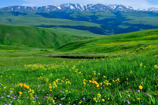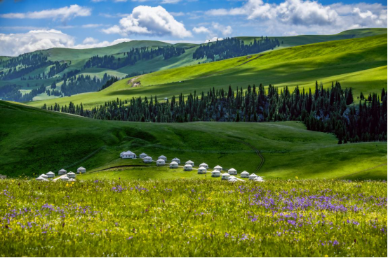 这片约150平方公里的广袤草原,夏季绿茵如毯、野花怒放、松树挺拔、碧水长流、牛羊成群、雪山映衬,多种多样的地形地貌相辅相成,置身其中犹如走进人间秘境,满眼都是诗情画意。